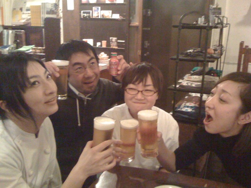 遅番スタッフのはま子にきめちゃん、店長ミヤザキとワタクシokayan、2009年最後の乾杯!…って、この後朝まで宴会が続くとは、この時誰も思わないのでありました(苦笑)。 とにもかくにも、おつかれさまでした!2009!ありがとう!2009!(お)