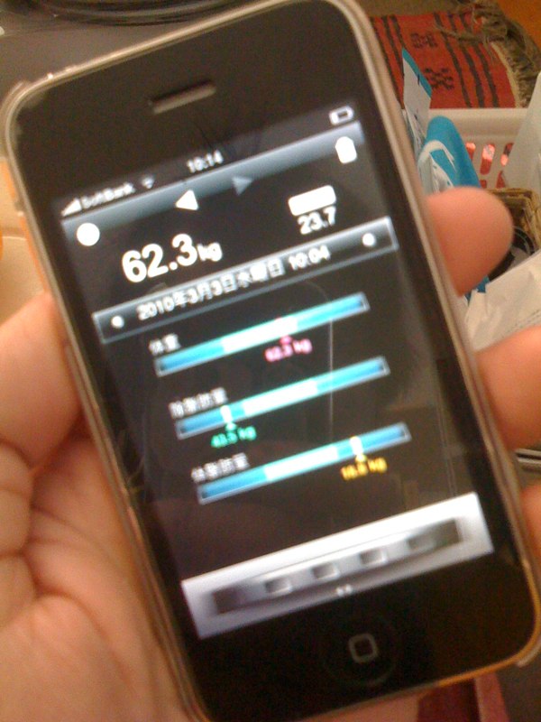 昨日届いたハイテク体重計…さっそく今朝、風呂上がりに量りまして、えぇ、朝だし、やや脱水でもありますしねと、肝心のそのデータが…ミヤザキのiPhoneに届いてしまうのでありました(苦笑)。やれやれ。(お)