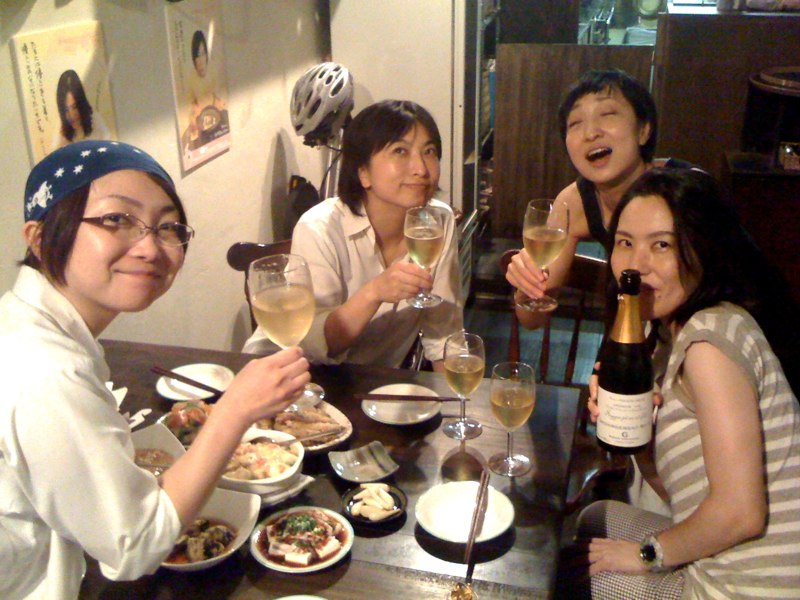 キッチンスタッフのはま子にホールスタッフのねえさんにきめちゃん、当店7月お誕生日のみなさんがたまたま大集合…案の定、閉店後、すっかり大宴会の予感(苦笑)。(お)