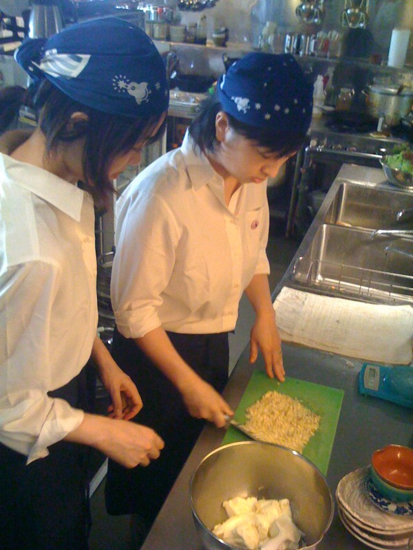 メニュー改訂から早10日…すっかり人気を博しております新定番のデザート「バナナカルダモンアイス」!店長ミヤザキからホールスタッフのぬまっちにその作り方が伝授されておるのであります…こうやってはじめて量産態勢に入れるわけであります!(お)