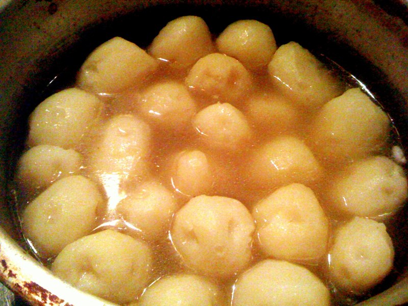 火もとおって、後は塩鶏の旨みを吸うだけのジャガさんたち。最近スタッフにも一番人気?!(麻)