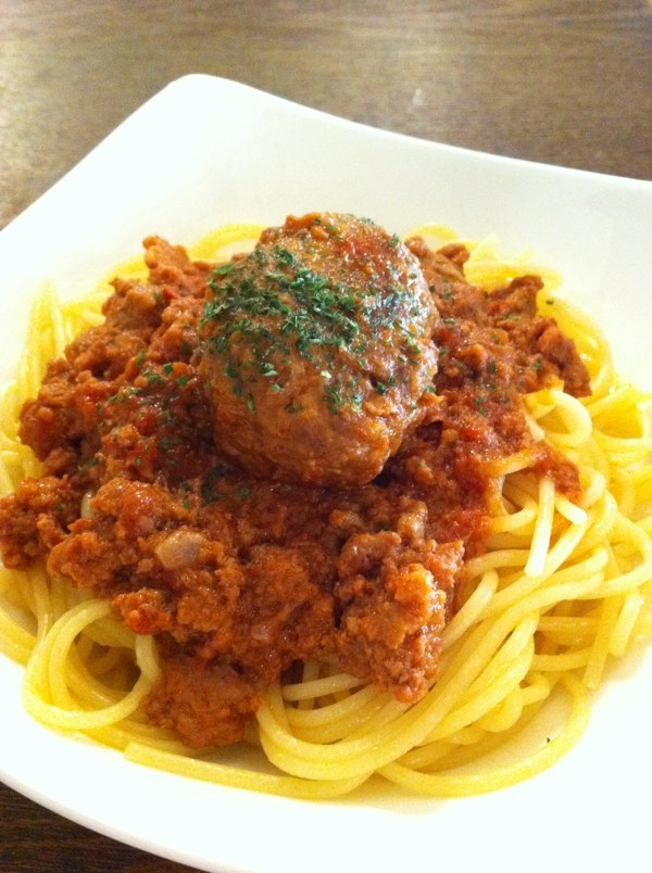 本日、ゴハンがなくなってしまったので、急遽パスタを買って来ました。肉だんごのスパイストマト煮込みミートソースのスパゲティ。もっとパンチを効かせればよかった!(麻)
