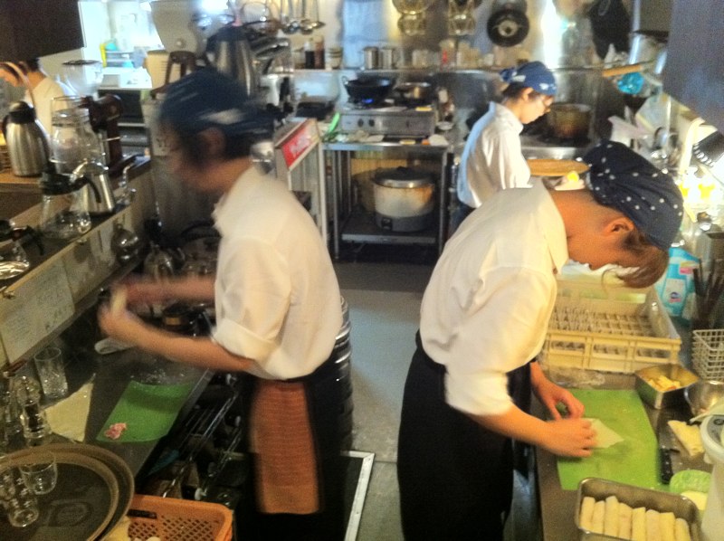 本日、通しシフトののだみと、遅番レギュラーのきめちゃん、背中合わせで仲良く(?)春巻きを巻いているのであります。きっと、ライバル心が激しく燃えさかっておることでありましょう(笑)。(お)