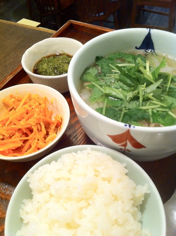 ごはんが完売御礼の昼の賄いは…ランチメニューのゆで豚のその茹で汁を使ったベトナム・フォー! あー、ワタクシは遅ごはんで、お米も炊き上がり、えぇ、炭水化物だらけの賄いでしたとさ(苦笑)。(お)