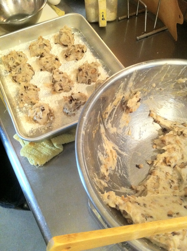 具材を合わせて、こんな風におだんご状にしておくんですね、なるほど~…って、揚げたてあつあつ、ホントうまいんだよな~(想像してごらん)。(お)