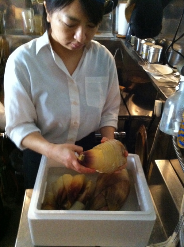 そのたけのこを、店長ミヤザキ下ごしらえ.....まずは皮をむいていくわけですが、どこまでむくのでありましょか?どこまで小さくなりますか.....それが問題だよな、確かに(笑)。(お)
