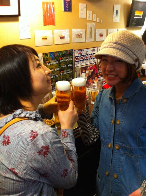 たかしまさんの展示を後にして…これからもワタクシドモはミヤザキ家のお食事会に向かうんですが、のだみといっしょにちょっとベルクで一杯ひっかけ中!(笑)(お)