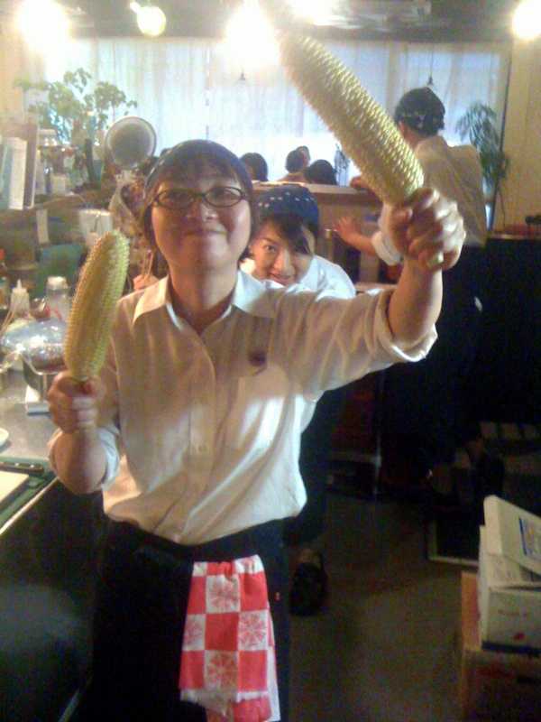 二刀流もろこしハマ子見参。美味しい揚げもろこしに、斬る‼のだ‼チラリズム店長のお姿がお茶目。(き)