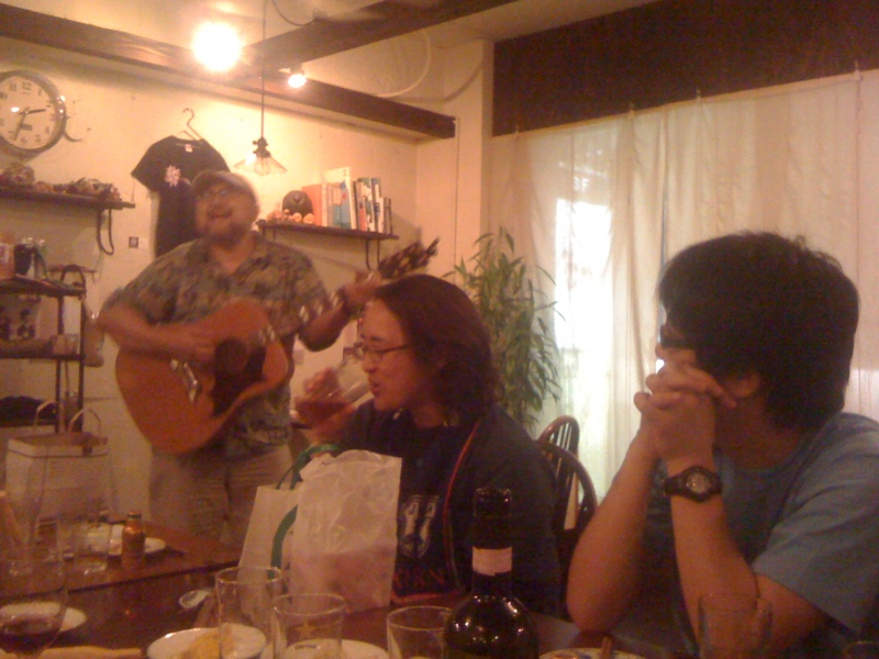 お馴染みのお客さまTさんの祝いの即興曲。気持ち良さげにギターをかき鳴らして唄う姿は素敵でした。実はこのギター、きめちゃんの彼の持参モノ。その彼も歌うたいでありまして・・・本当に素敵なステージが続いたのでありました!(ぬ)