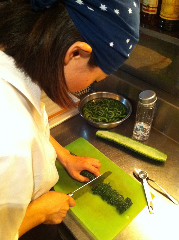 きめちゃん卒業あと、今週は平日夜番を任されております伊藤ちゃん.....えぇ、以前より仕込みの手伝い・作業が多くなってますね、がんばって下さいねと、本日はゴーヤの下ごしらえですよ!(お)