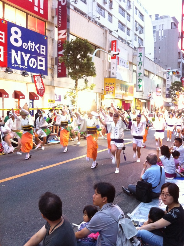 続いて花形、おそろいの衣装、笠をかぶった女性の踊り子さんが軽快なリズムで躍り込み!.....イイネ!実にイイネッ!ヤットヤットサ〜!(お)