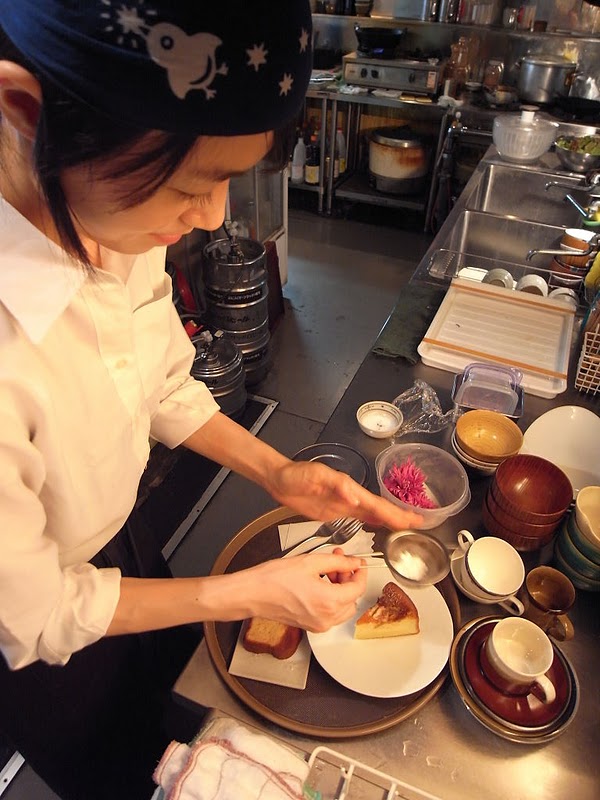 季節のデザート「いちじくのケーキ」…いつもならミントを飾るところなんですが、せっかくきれいな紫の食用菊「もってのほか」があるんだからと、ちょいと彩を添えて、仕上げにシュガーパウダーを振りましょう…って、まるでお化粧してるみたいですね、なんとなく。(お)