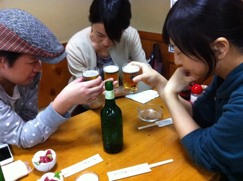 ということで、今夜リリーフエース的登板でしたきめちゃん…いや、そんなきめちゃんのために駆けつけてきてくれたおなじみのお客さんといっしょに閉店後、まずは乾杯!…って、きめちゃん、久しぶりのビールらしいです(笑)、えぇ、好きなだけのんでヨシ!(笑)(お)
