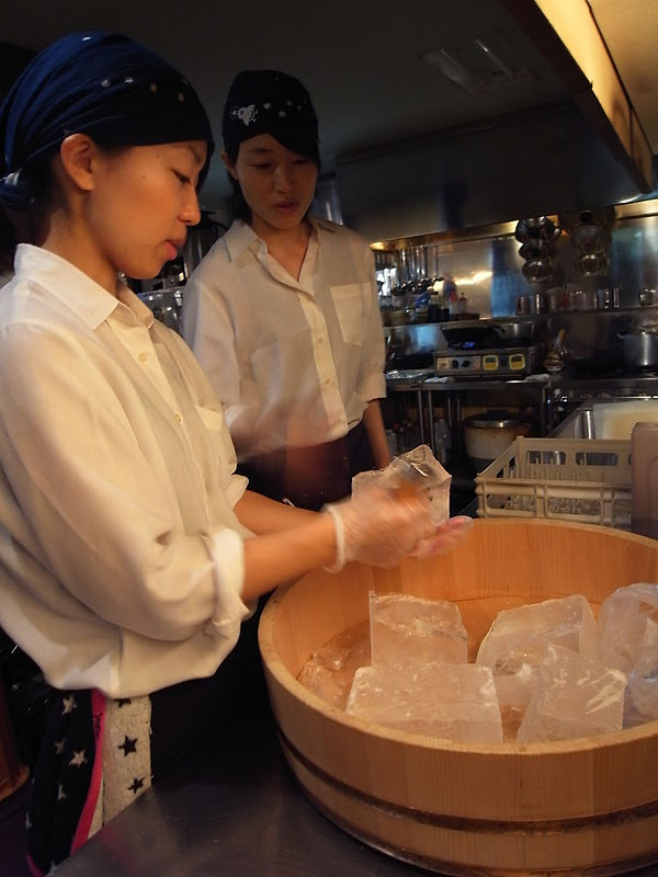 夏はすっかり終わってしまいましたが、えぇ、ロック氷は必要ですよと、ぬまっちが伊藤ちゃんに氷割りのレクチャーを…って、以外に思い通の大きさや形に割るの、難しいんですよね…えぇ、まずはイメージしてから、アイスピックを使うのがコツです、ハイ。(お)