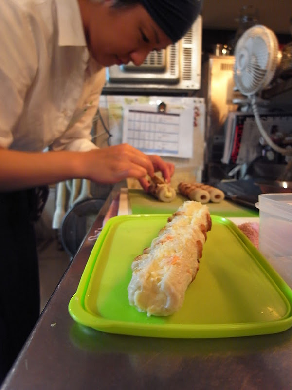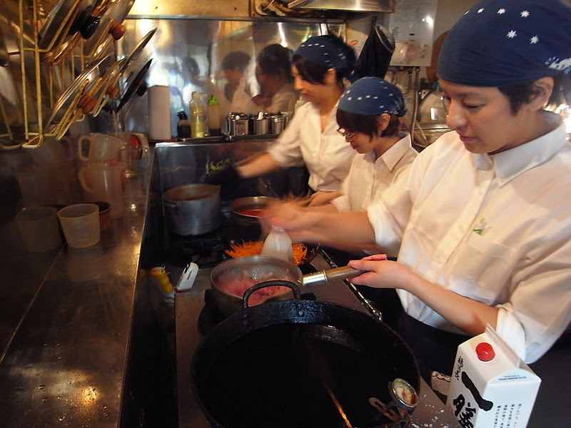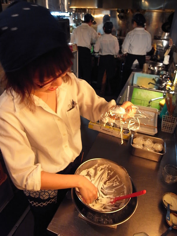 今日は生クリームを泡立ててくれたイノさん、最後にラップに小分けにしましょうと…あー、最後の最後でちょっと失敗(笑)、いや、ま、それもまたご愛嬌ということで(笑)。うしろじゃ、またしてもキッチン三人がなにやら仲良く仕事中(笑)。(お)