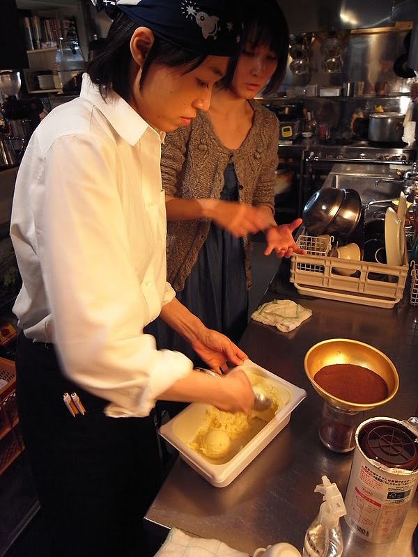 今月からお出ししております「アップルパイ・アイスクリーム添え」…もっとバニラアイスをうまく盛り付けようと、元デザート職人のホーリーに、くるんとアイスをすくうアイスクリームディッシャーを調達してきてもらい、早速、そのすくい方をぬまっちにコーチしてもらいました…って、これがなかなかうまくいくね(笑)、ヨカッタね!(お)