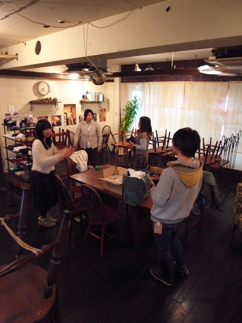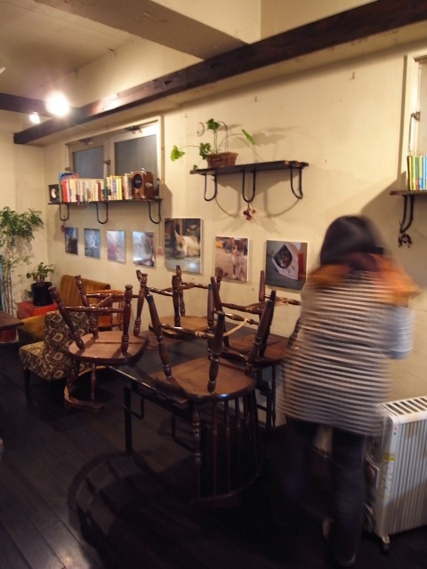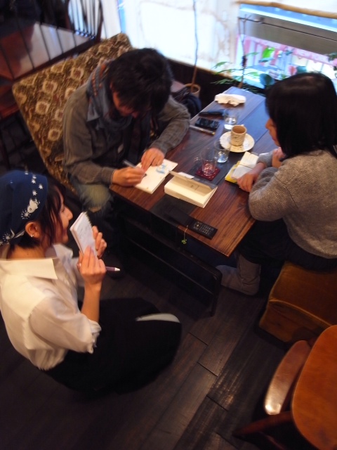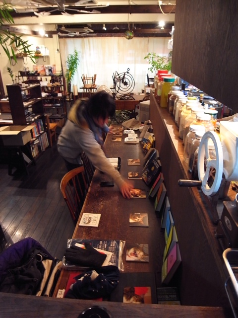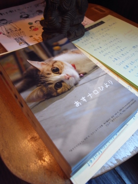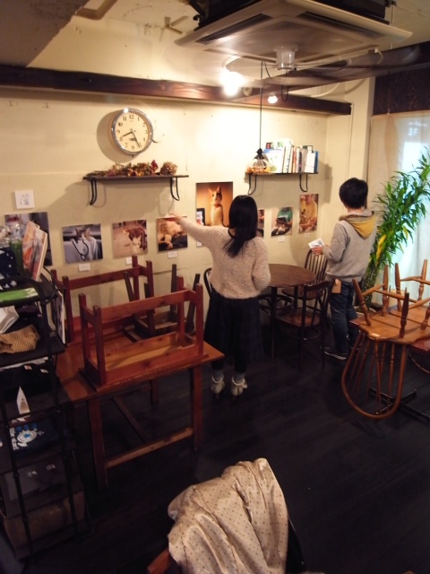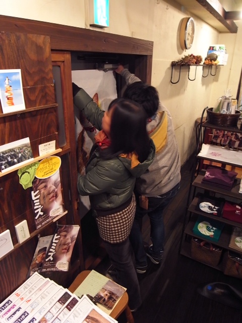 ということで、定休日の夜、明日からはじまる「あすナロびより、(てん)」の展示搬入、たかしまてつをさんとなかむらさん、そしてお手伝いのお友達の3人さんがせっせと準備中であります!まずは前回もたくさんの寄せ書きメッセージをいただいた入り口扉の大きな直筆ポスター!(お)