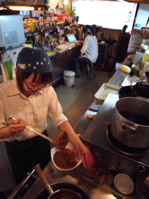 週末は期間限定「チキンカツカレー」もお楽しみいただいております当店でございますが、えぇ、賄いもカツカレーは…キッチンふたり、店長ミヤザキとはま子であります、あー!ルゥがぁ〜〜っ!って、はまちゃん、慎重にいこう、慎重に(笑)。(お)