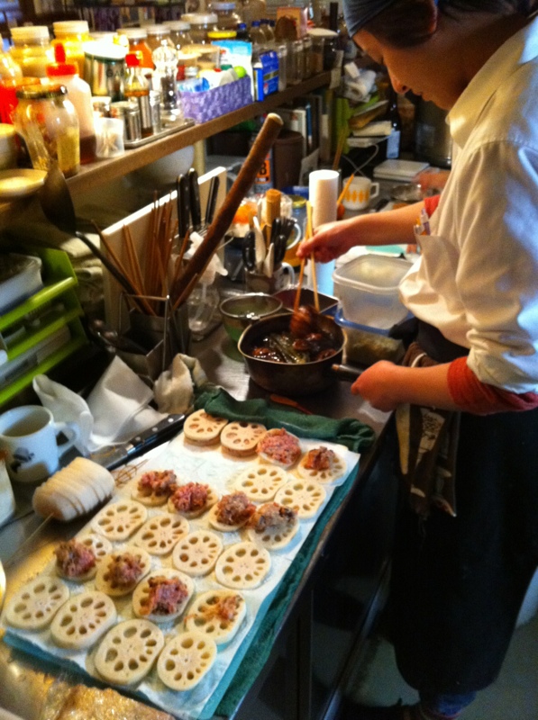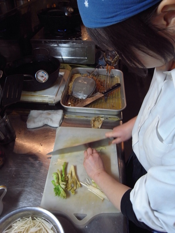 お!今度はホーリー、選別しながらちょこちょこ摘んでいるのはセリですね!あぁ、春の七草のひとつ、さっぱりした香りかいいですよね!…って、これは本日のおススメ「大根とせり、ホタテのサラダ」ですね!春はそこまで、るるるる〜っと。(笑)(お)
