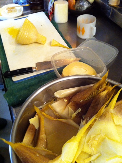 ヒロヤショップさんで下茹でされたたけのこ、皮をはいで、さっくり下ごしらえ中ですよ!(お)