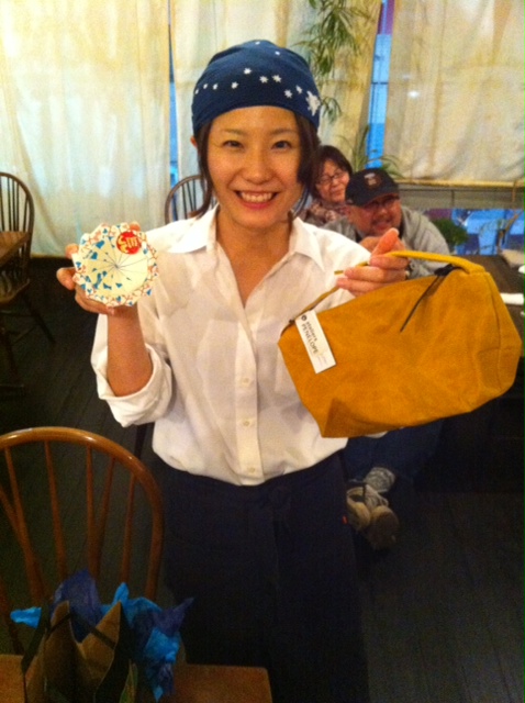 ワタクシドモオーナー夫婦からはアトリエペネロープさんの小さなカバンを、他のスタッフからは石けんとかハンドクリームとか、小さなクマのブローチとか…えぇ、とにもかくにも、まっつんがよろこんでくれてなにより(笑)…って、おなじみのお客さんが、肩越しにチラリもイイネ!(笑)(お)