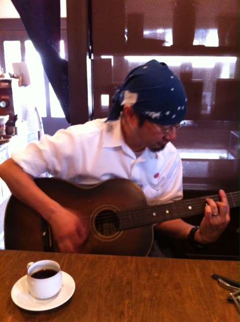 いつもの豆を取りにお伺いしがてら、毎度のコーヒーブレイクは、最近すっかり定着しつつあります(?)、ギターで気分転換なう(笑)。今日は片付けをしてたら出で来たという、まほろばさんの古いギターを弾かせていただいております、えぇ、実に楽しい(笑)。(お)