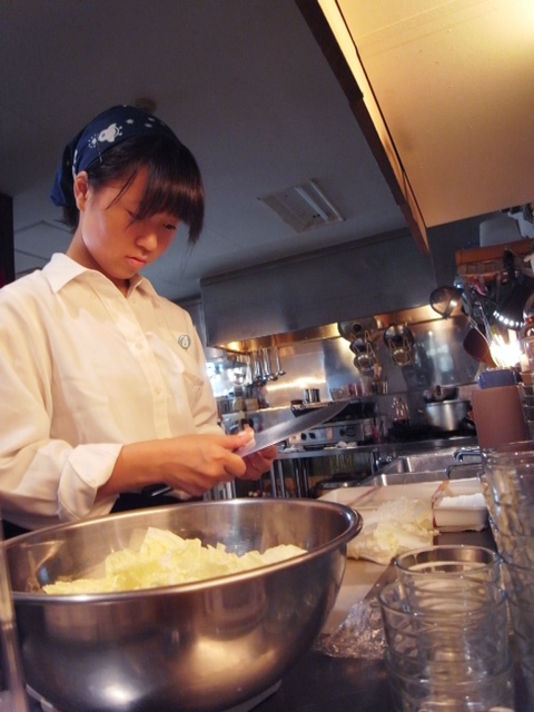 大学生は夏休み!のホールスタッフ、にゃんさん、今日は早番ランチ営業のあと、賄いたべてちょっと残業をオネガイシマスと、白菜のお新香漬けに勤しんでくれております、頼みましたよ〜(ワタクシはちょっと昼寝を…苦笑)(お)