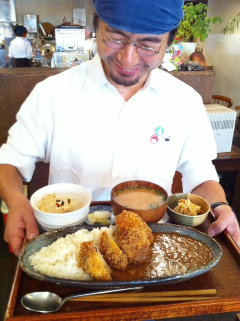 ワタクシも今日は何とかカツカレーがたべたいなと、えぇ、狙ってはみたものの…あー、完売御礼!あーざっす!(泣)って、そんなワタクシ見るに見兼ねたキッチンスタッフのはまちゃんが、本日の日替わり「茄子のひき肉サンドフライ」の乗ったスペシャルなカレーをつくってくれました!サンキュゥ!はまちゃん、恩に着る!(笑)賄いならではのひとこまでありました、ハイ。(お)