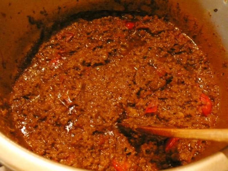 カレー粉と炒めた挽き肉と合わせてぐつぐつ。ここに、素揚げした茄子と枝豆を混ぜ込んで…『茄子とトマト枝豆のキーマカレー』、本日初登場です。今夜はカレー、いかがですか?(ぬ)