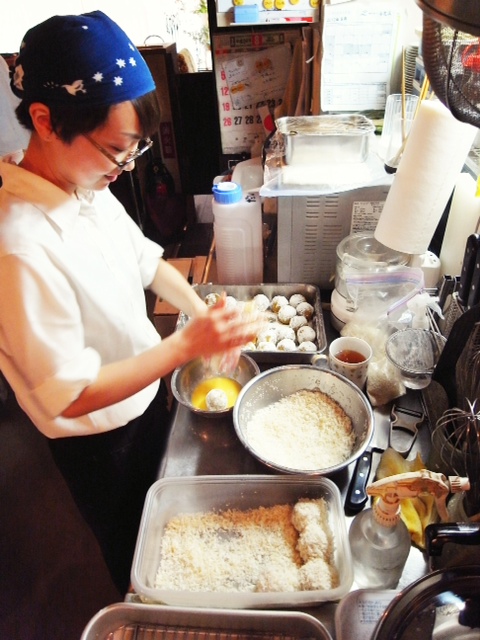 団子をまるめて、たまごつけて、コロモつけて…三段階展開で仕込み中のはまちゃん、もちろんそれは人気のあのメニュー!(つづく)。(お)