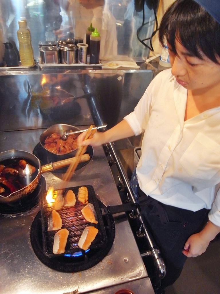 こっちで本日のお昼メニュー「鮭とれんこんきのこの焼きびたし」の鮭をこんがり焼きつつ、あっちでは夜の小さな人気メニュー「鶏肉のにんにく煮」をいい匂いさせつつ煮ております昨日昼下がりの店長ミヤザキ、二刀流でございました、えぇ、そんなところで(笑)。(お)