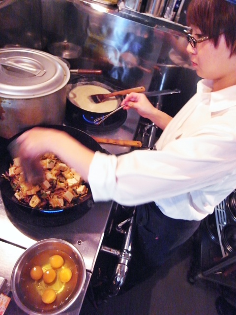あぁ、台風の夜ですねと、あー、お客さんは来るんかいなの日曜日の夜ですが、えぇ、もちろんキッチンいつも通りの仕込みでみなさんのご来店をお待ちしておるわけであります…と、当店キッチンスタッフ・世界最小シェフ(暫定)のはまちゃんは、地味ですがとってもおいしいお通しを…「厚揚げの炒り煮」をこしらえ中。じゃっと味を付けて、あとは玉子でちょいと閉じたら出来上がりっと!(お)