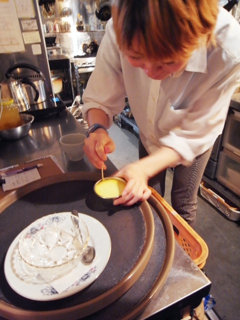 あー、マンヲジシテ10月の季節のデザートはこいけ菓子店謹製「かぼちゃのプリン」!…ということで、本日昼の賄い後、ホールスタッフのささぽんがプリン型から竹串でくるりと抜き出す練習を(笑)。いや、もちろんうまくいきました、えぇ、肝心のそのプリンは、あとで沼田さんにアップしてもらいますね!(お)
