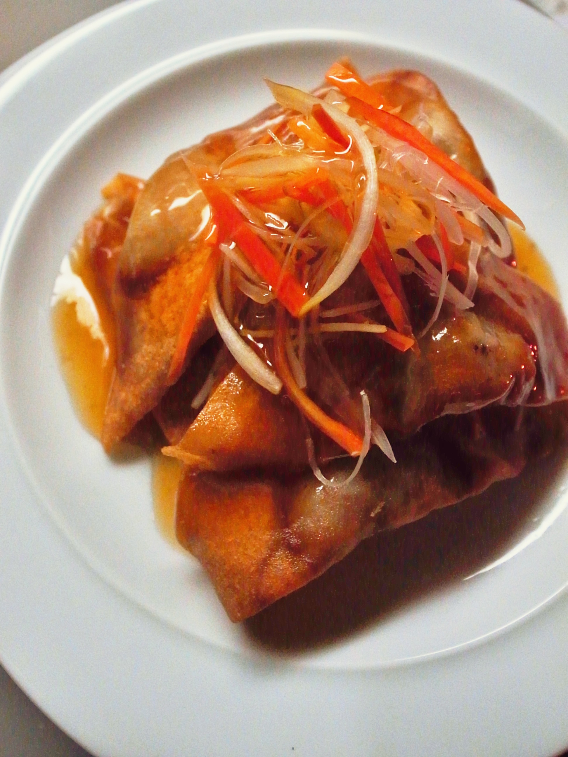 パリパリしたものに弱いんですよ〜ワタクシ。で、急に食べたくなって作りました揚げワンタン。海老と豚ひき肉に生姜汁をたっぷりしぼってつくった餡をパリパリの皮で包んである…ワンタンの主役は餡より皮!だけど餡とのバランスが大事です。香味野菜をのっけて上から甘酢だれをとろーり、中華風なような、昭和風なような、懐かしいかんじのおつまみです(麻)
