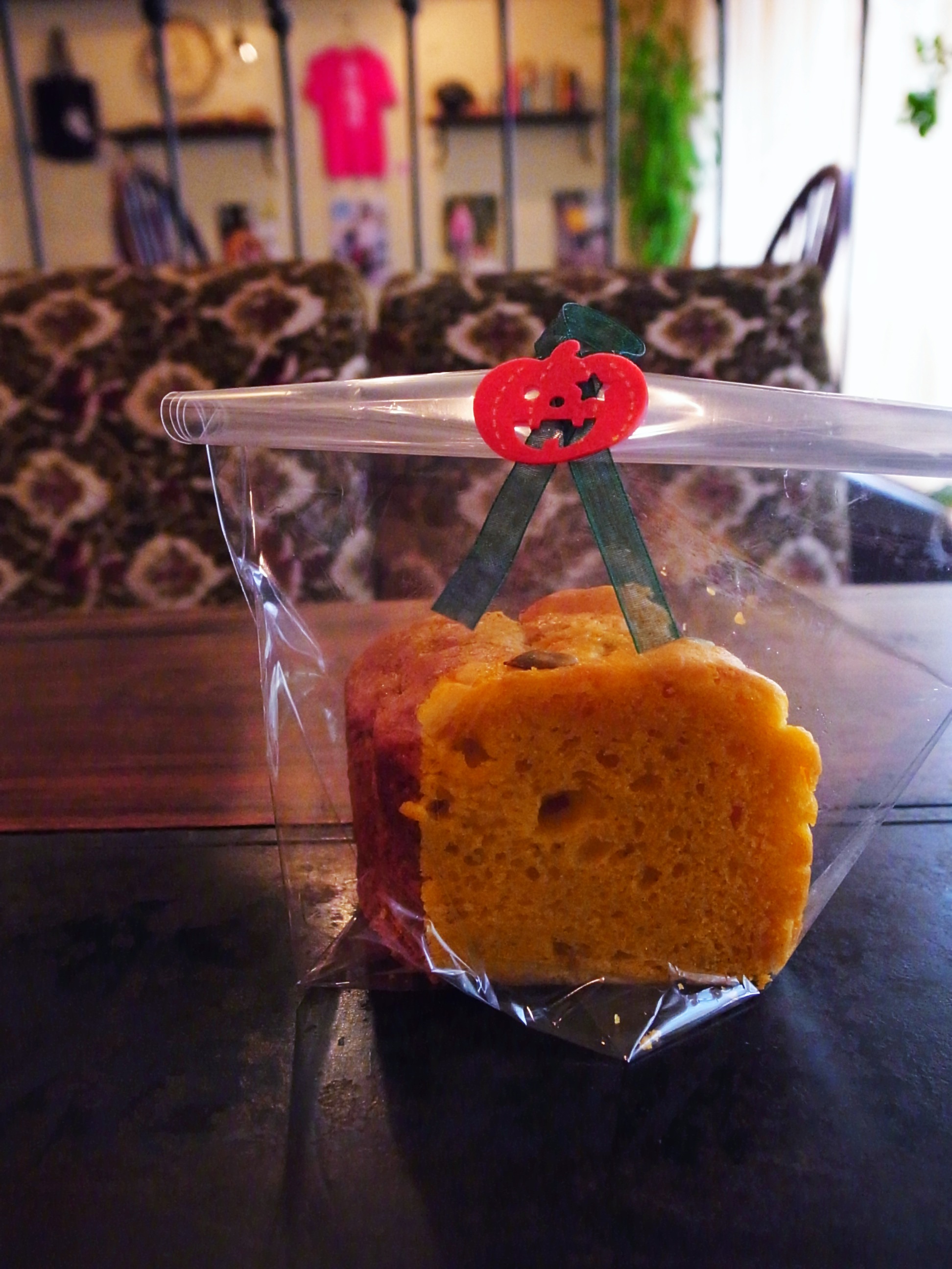 今日の朝出勤したら、楽しいこと大好きホーリーから「ハッピーハロウィーン!」と、おやつをいただきました。見た目もかわいいこのおやつ、もちろんホーリーの手作り。卵とバター不使用のヘルシーなやさしいお菓子は、かぼちゃのケーキと、りんごとレーズンのケーキ。旬の美味しさとハロウィンの楽しさいっぱいのおやつ、ありがとう!(麻)