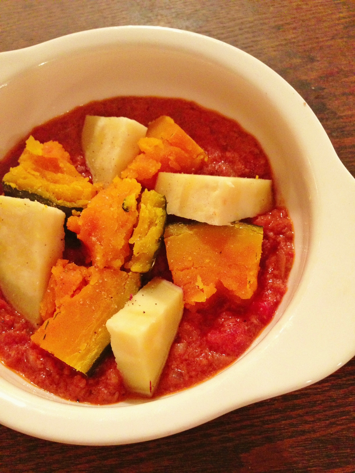 今日からグラタンが、カボチャとサツマイモのミートソースグラタンに切り替わります。クリスマスディナーで好評だった組み合わせ、表面はホワイトソースとチーズで白っぽいですが、中身はこんなにカラフルです!ほっこり旨し!(麻)