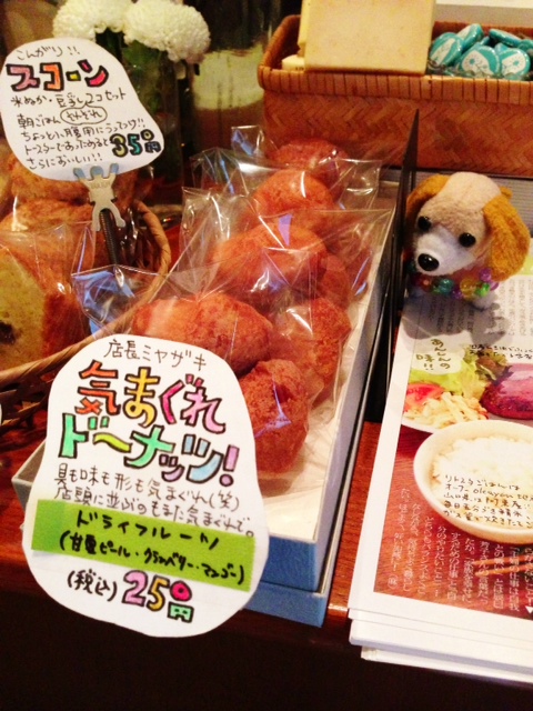 あー、週明けちょっとヒマだったのもあって、久しぶりに登場は店長ミヤザキ「気まぐれドーナッツ」!(笑)今回はドライフルーツ3種セット!…って、気になるのは写真右上の小さな犬のぬいぐるみよね…(笑)。(お)