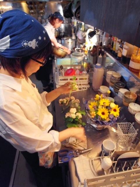 あー、今月1日当店開店記念日のお祝いにいただいたお花も、そろそろしおれたり、枯れてきたりしたものも目立ってきましたねと、えぇ、そんな水曜日、本日遅番シフトインは、長らくお花屋でのバイト経験もあるイノさん!当店植物部長の出番です!と、ちゃちゃっと生け替えてくれております、えぇ、芸達者なスタッフ揃いで助かります、ハイ(笑)。(お)
