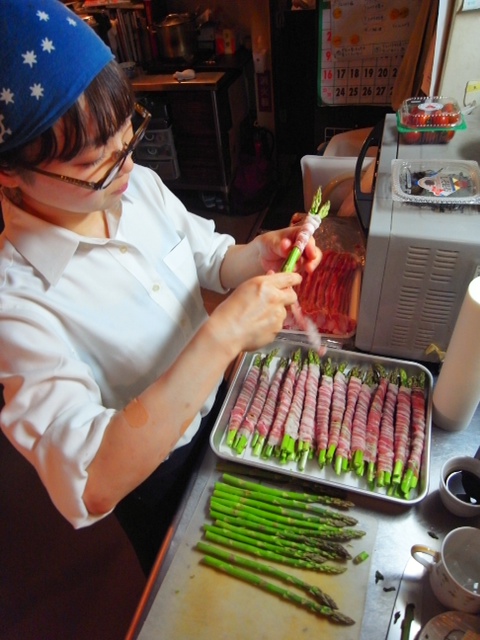 はまちゃんがぎゅぎゅっと巻いております「アスパラの豚肉巻フライ」!…ぷりぷり旬の甘いアスパラ!豚肉の旨味!さくさくコロモの食感!…からり揚げたて、ソースでだぼだぼいただきましょう!そうしましょう!…つか、そうしたい!(ワタクシ的、賄い希望!…笑)明日のお昼はみなさんぜひぜひ〜っ!(お)