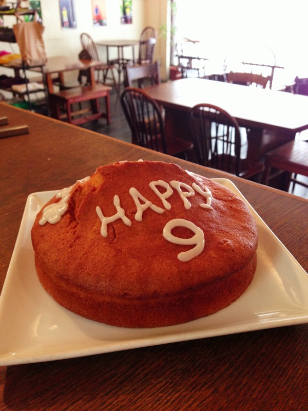 開店前、いつもリトスタのケーキを作ってくれている、こいけ菓子店(けーこちゃん)から、9周年のお祝いのケーキをいただきました!シンプルなブランデーケーキらしいですよ!ハッピーハッピー!で9年目も張り切ってまいりましょう!(麻)