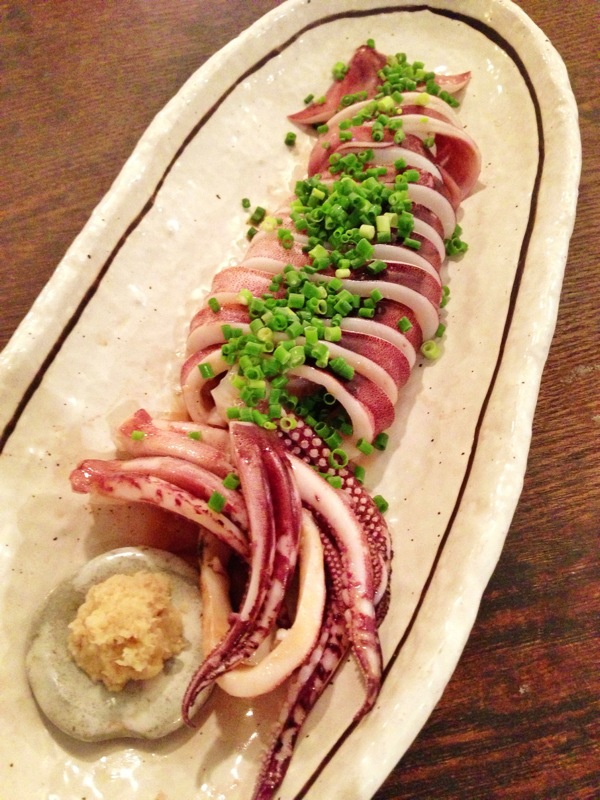 当店のイカメニューと言えば、イカワタ炒めが人気ですが、さっと茹でただけの「イカの丸茹で・肝しょうゆ」も、さっぱりしてイイですよ!肝もそのままに丸茹でにしたイカを生姜醤油で、肝とあえながらいただきます。残暑にぴったりの酒の肴です(麻)