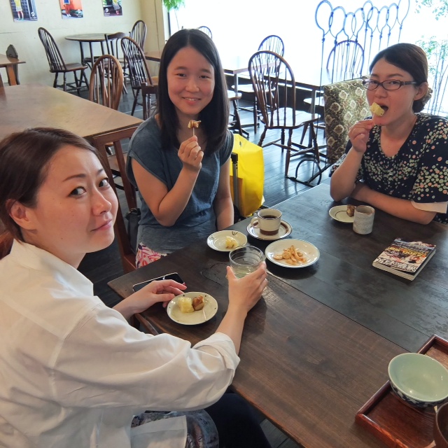 さてさて木曜日、ランチタイムも終わり…ささぽんとうめさんは仲よく賄いもたべ終わり…なんだかちょっと食後に甘いものでもつまみたいねと…って、お店のおやつ箱には甘いものがなく…と、そんなところに甘ものお土産を持って現れたのは、先日からちょっと実家に帰省た大学生スタッフのにゃんさん!いや、戻って来たその足で顔を出してくれましたよと、えぇ、一同オオヨロコビ(笑)。記念にパチリと、この3人で写真を撮るのは珍しいもんね!(笑)(お)