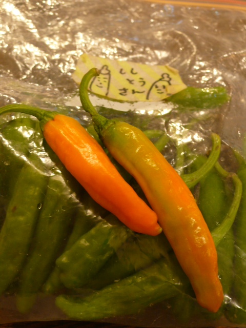 どうしちゃったの、ししとうさん!今日仕入れたししとうの中に赤いコが2人。なんだか辛そうな顔してますが…仮装ですか??(笑)『皆さま、ハッピーハロウィン☆』とな。(ぬ)