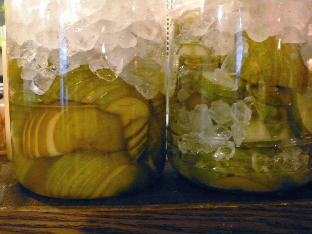 私が一年の中で実は一番楽しみにしている作業がこちら。(洋梨の姿も、味も食感も好き!)洋梨を半月切りにして氷砂糖でエキスを抽出するのです。美味しいジュースのモト!すでにこんこんとエキスが出てきております。今年も美味しく出来上がりますよ〜に!(ぬ)