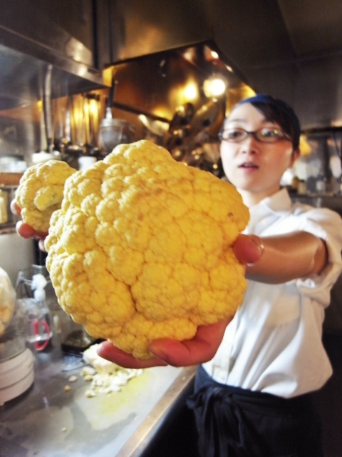 さて、本日絶賛おススメ中でありますのが「オレンジカリフラワーのチーズフリット」…そのオレンジカリフラワーは三鷹産の新鮮ぷりぷり!実においしそうでありますね!と…あー、小柄なキッチンスタッフはまちゃんの脳くらいありそうだよね、そうだよねと(笑)…あー、話が変な方向へ行こうとしてないかい?と(苦笑)、えぇ、本日のおススメです!(笑)(お)