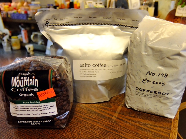 あー、忙しかった週末上がりの定休日は月曜日…いやいや、ワタクシドモオーナー夫婦にレギュラースタッフはまちゃんに沼田さん、午後から休日出勤してあれこれ小さな作業も…って、ひとまずおいしい珈琲でも淹れましょうかと、秋休みにみんなが買って来た、徳島のアアルトコーヒー、山口のCoffeeBoy、のだみのラオス土産のラオコーヒー…よりどりみどりでいきましょう(笑)。(お)