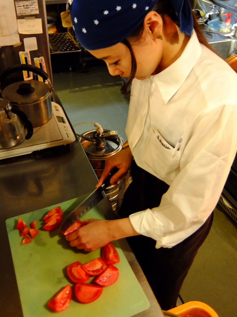 この春にうちに加わった…今んところ一番の新人スタッフ・コジコ、基本のホールでの仕事に加えて、この頃遅番のシフトに、ドリンカー、キッチンの仕込み手伝いと仕事の幅を広げてきてます…いや、着々とがんばってくださいねと、ぴかぴかトマトは、スッとよく切れる包丁で切るのがよいと、えぇ、オッサンもついつい口を挟んでしまう、年末金曜冬の午後であります、ハイ(笑)。(お)