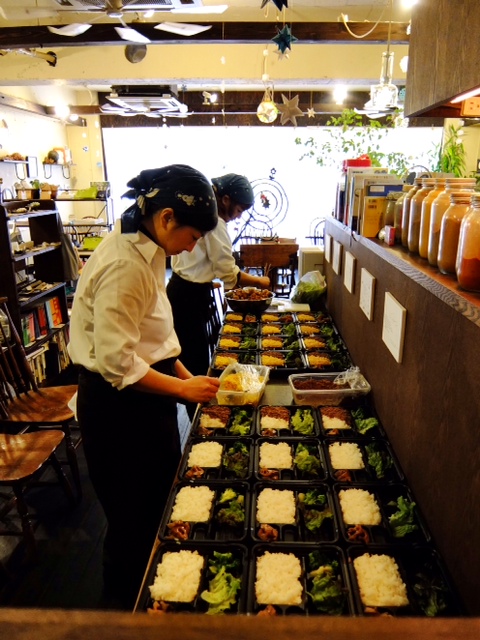 いやいや、やっぱり二色のそぼろをきれいに盛り付けるには、それはそれなりに時間がかかりますよと…それ以外のおかずは全てキッチンスタッフはのだみが盛りつけます!…こうゆう時ののだみのスピードは実に頼りになります(笑)…れんこんのきんぴらにサニーレタスは付け合わせ、からり揚げたて鶏のから揚げをびゅんびゅん盛りつける!(笑)(お)
