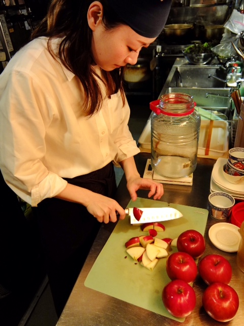 あぁ、素晴らしく真っ赤なりんごですねと、えぇ、その名の通りですね紅玉りんご、冬の当店ミックスフルーツ酢の定番、ホールスタッフのささぽんが、包丁でさくさく切って下準備…りんごはなんにも言わないけれど…りんごの気持ちはさて如何に?(笑)(お)