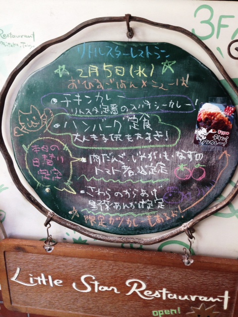 あー、実は今朝はワタクシokayan、所用がございまして、えぇ、出勤が開店に間に合わなかったもんですから…えぇビル1Fの黒板はキッチンスタッフ、ことデザイナーでもありますのだみさんにお願いしましたが、えぇ、さすがに当店ファンシー部長!(笑)…開店以来最もゆる〜いランチ告知となりました、いや、たまにはこうゆうのもいいですかね?(笑)のだみサンキュウ!(お)